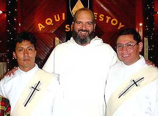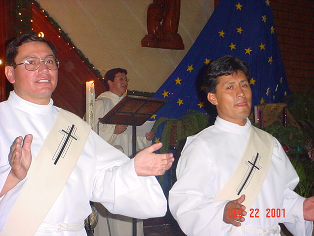 This evening, Saturday December 22, two more Bolivians were ordained to the diaconate. Juan Carlos Molina Enriquez, from Oruro, and Felix Serrudo Betanzos, from near Sucre, were ordained by the Archbishop of Cochabamba, Mons. Tito Solari in Centro San Martin. They will both be working in St. Pius in Chicago for three months, brushing up on their English and working in the parish. Then they will return to Cochabamba to begin preparing for their future assignments as formators. Please continue praying for Bolivian vocations, and thanking God for the gift of these two fine men.